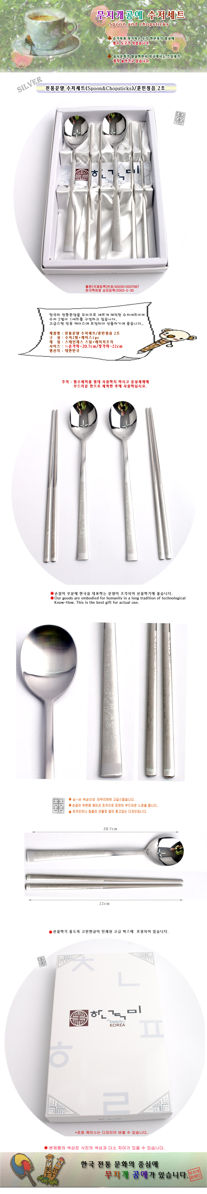 제품 요약 정보 전통문양이 새겨진 실버 수저세트로 실용적이며 외국인 선물에 좋습니다.