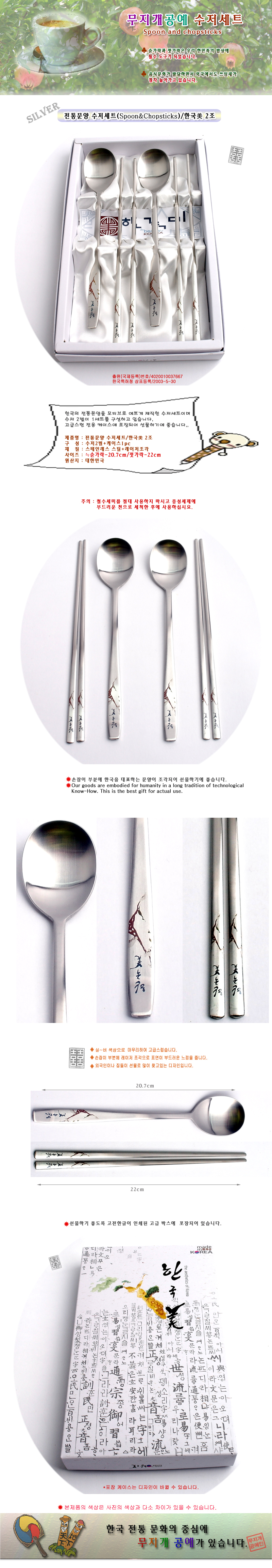 제품 요약 정보 전통문양이 새겨진 실버 수저세트로 실용적이며 외국인 선물에 좋습니다.
