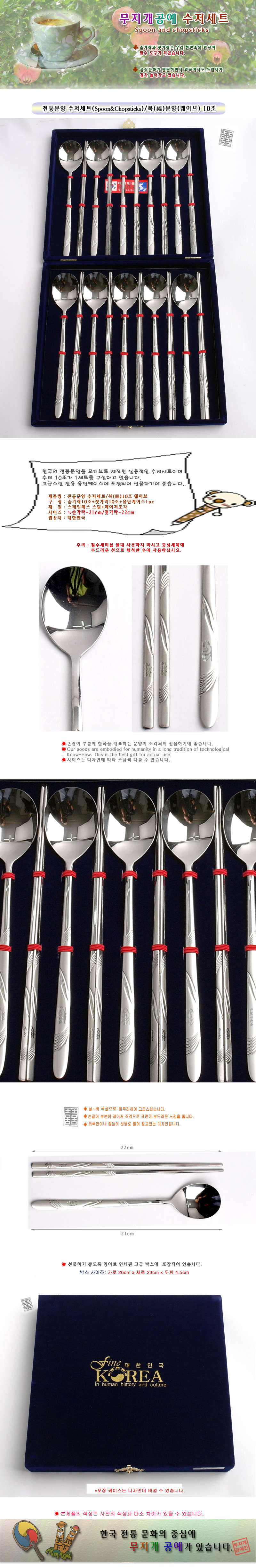 제품 요약 정보 전통문양이 새겨진 수저세트로 실용적이며 외국인 및 집들이 선물에 좋습니다.