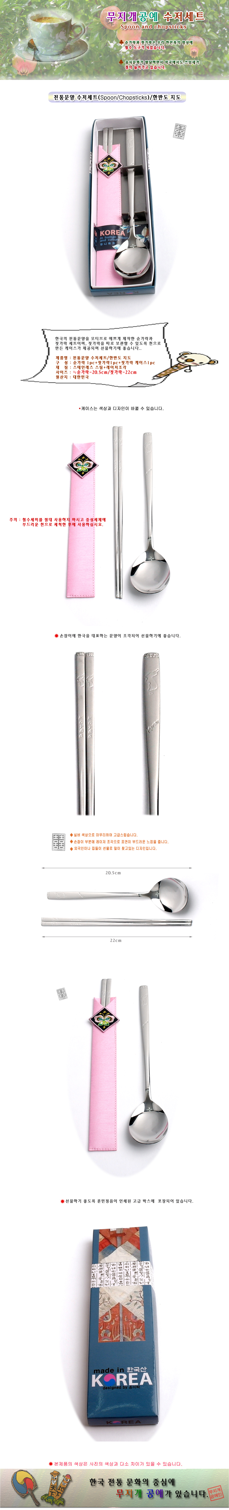 제품 요약 정보 전통문양이 새겨진 수저세트로 외국인 선물에 좋습니다.