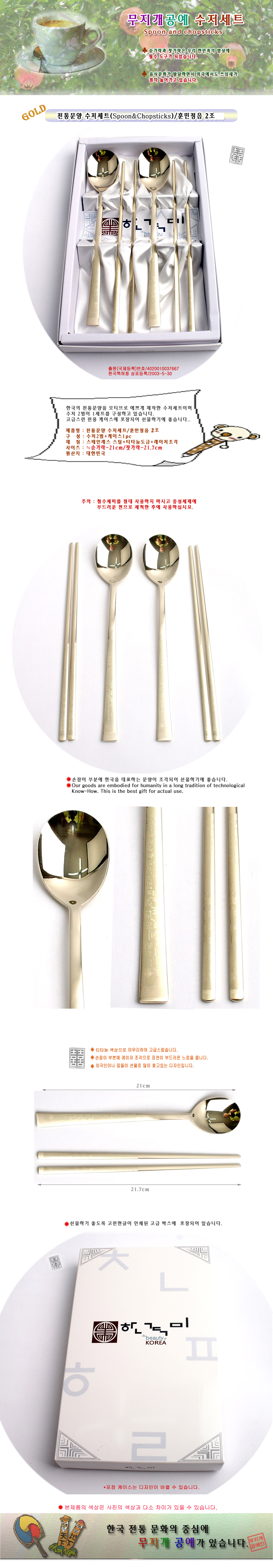 제품 요약 정보 전통문양이 새겨진 금장 수저세트로 실용적이며 외국인 선물에 좋습니다.