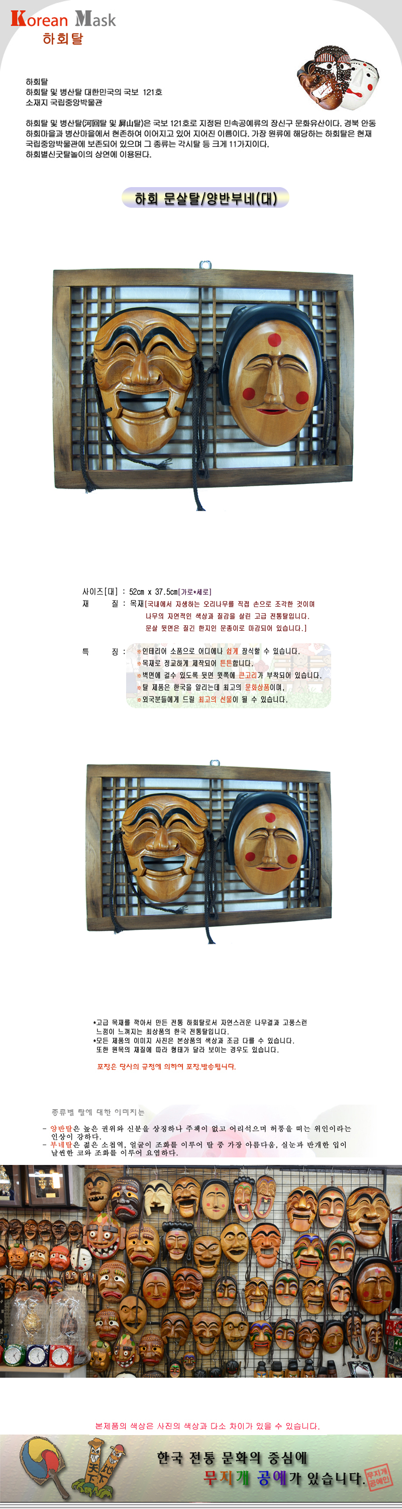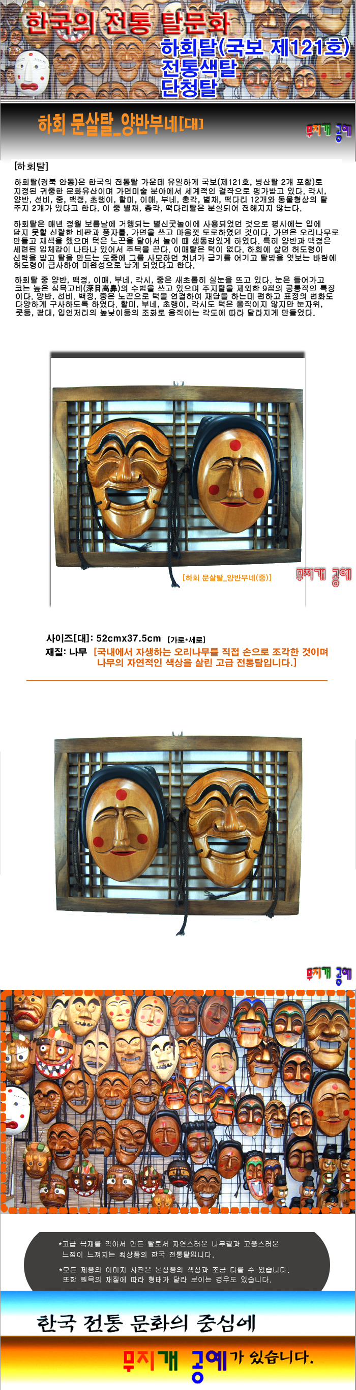 제품 요약 정보 정통 하회탈을 문살액자에 붙혀 선물용이나 장식용으로 제작한 문살탈 액자